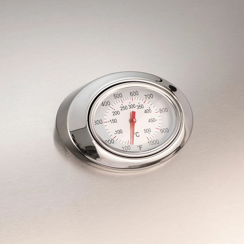 An analog thermometer with polished stainless steel bezel is embedded in the hood. It is large and attractive with a forward angle for easy viewing.